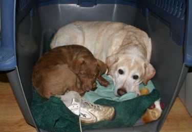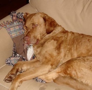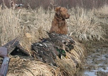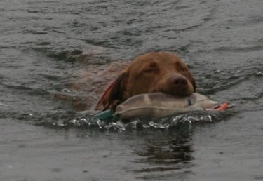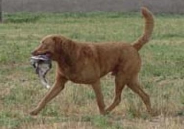 Equally proficient on land and in the water, the Chesapeake Bay Retriever was developed along the Chesapeake Bay to hunt waterfowl under the most adverse weather and water conditions, often having to break ice during the course of many strenuous multiple retrieves. Frequently the Chesapeake must face wind, tide and long cold swims in its work. The breed's characteristics are specifically suited to enable the Chesapeake to function with ease, efficiency and endurance. In head, the Chesapeake's skull is broad and round with a medium stop. The jaws should be of sufficient length and strength to carry large game birds with an easy, tender hold. The double coat consists of a short, harsh, wavy outer coat and a dense, fine, wooly undercoat containing an abundance of natural oil and is ideally suited for the icy rugged conditions of weather the Chesapeake often works in. In body, the Chesapeake is a strong, well balanced, powerfully built animal of moderate size and medium length in body and leg, deep and wide in chest, the shoulders built with full liberty of movement, and with no tendency to weakness in any feature, particularly the rear. The power though, should not be at the expense of agility and stamina. Size and substance should not be excessive as this is a working retriever of an active nature. Distinctive features include eyes that are very clear, of yellowish or amber hue, hindquarters as high or a trifle higher than the shoulders, and a double coat which tends to wave on shoulders, neck, back and loins only. The Chesapeake is valued for its bright and happy disposition, intelligence, quiet good sense, and affectionate protective nature. Extreme shyness or extreme aggressive tendencies are not desirable in the breed as a gun dog or companion.